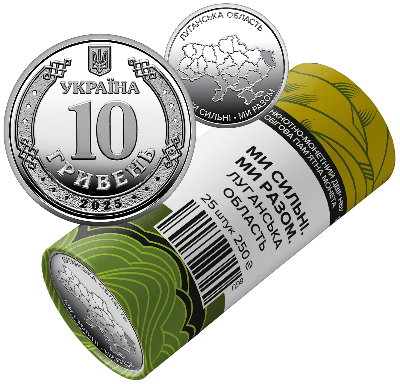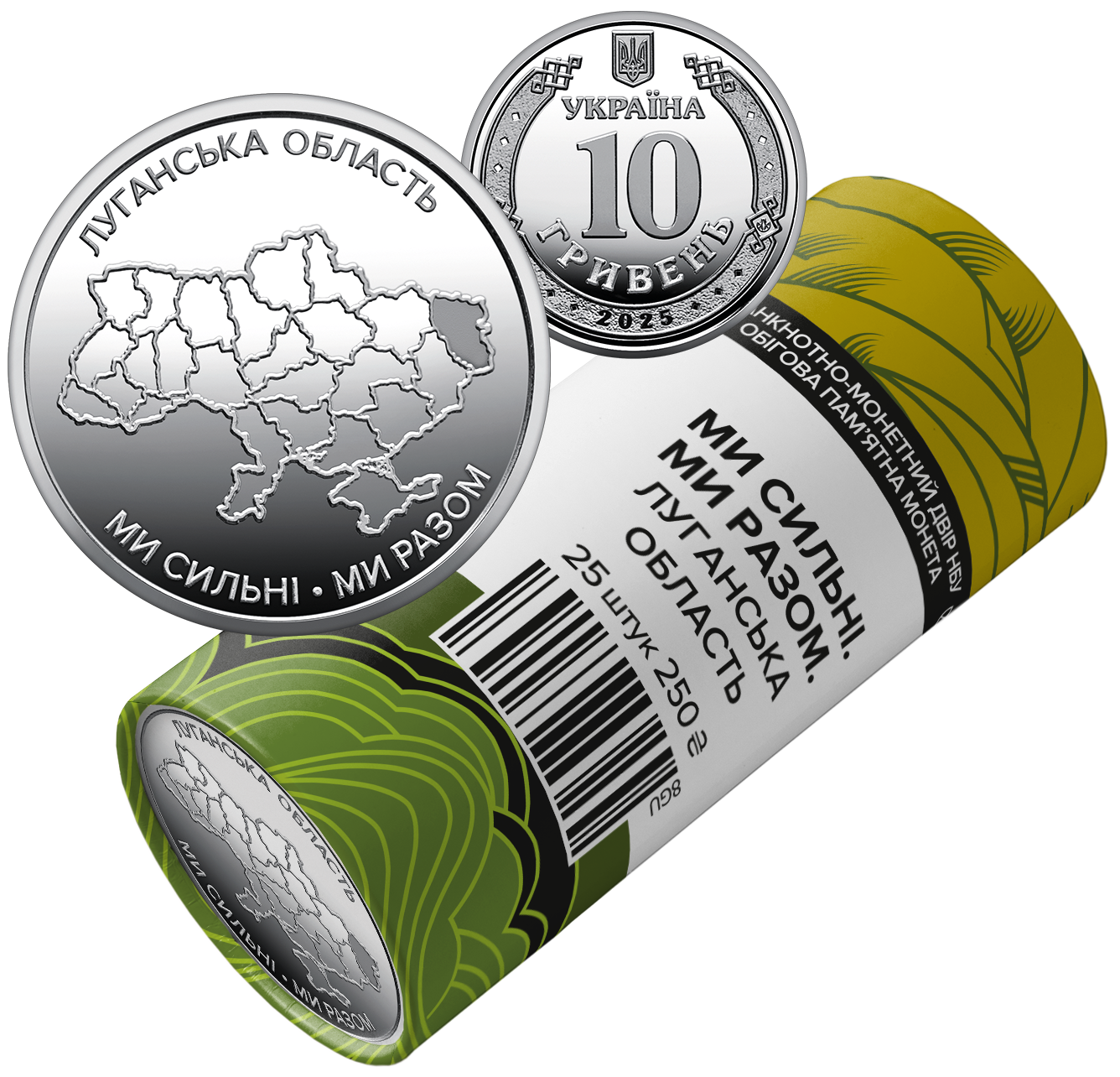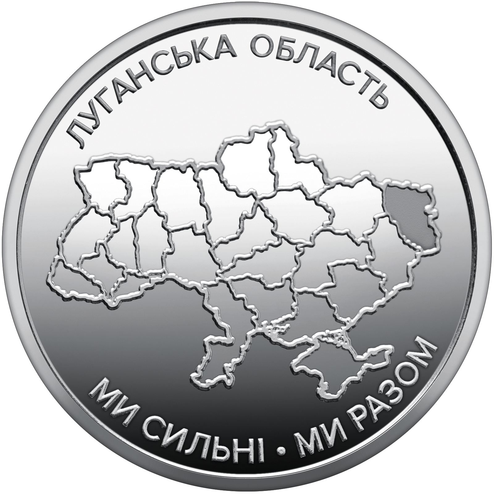 Обігова пам’ятна монета “Ми сильні. Ми разом. Луганська область”, присвячена невід’ємній частині України, визначеній Конституцією України, – Луганській області. Її територіальна належність до України підтверджена міжнародним правом і визнана світовою спільнотою.