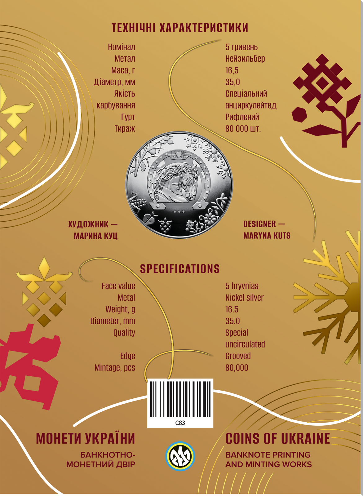 Пам’ятна монета присвячену одній із дванадцяти тварин китайського зодіаку. Кінь – сьомий знак східного календаря, що уособлює активність, життєлюбство, незалежність, витривалість і цілеспрямованість. У традиційній китайській астрології він належить до типу “Ян” та асоціюється зі стихією Вогню, яка символізує динаміку, рішучість і прагнення до свободи. Водночас цьому знаку притаманні імпульсивність, нетерпимість до обмежень і схильність до ризику.