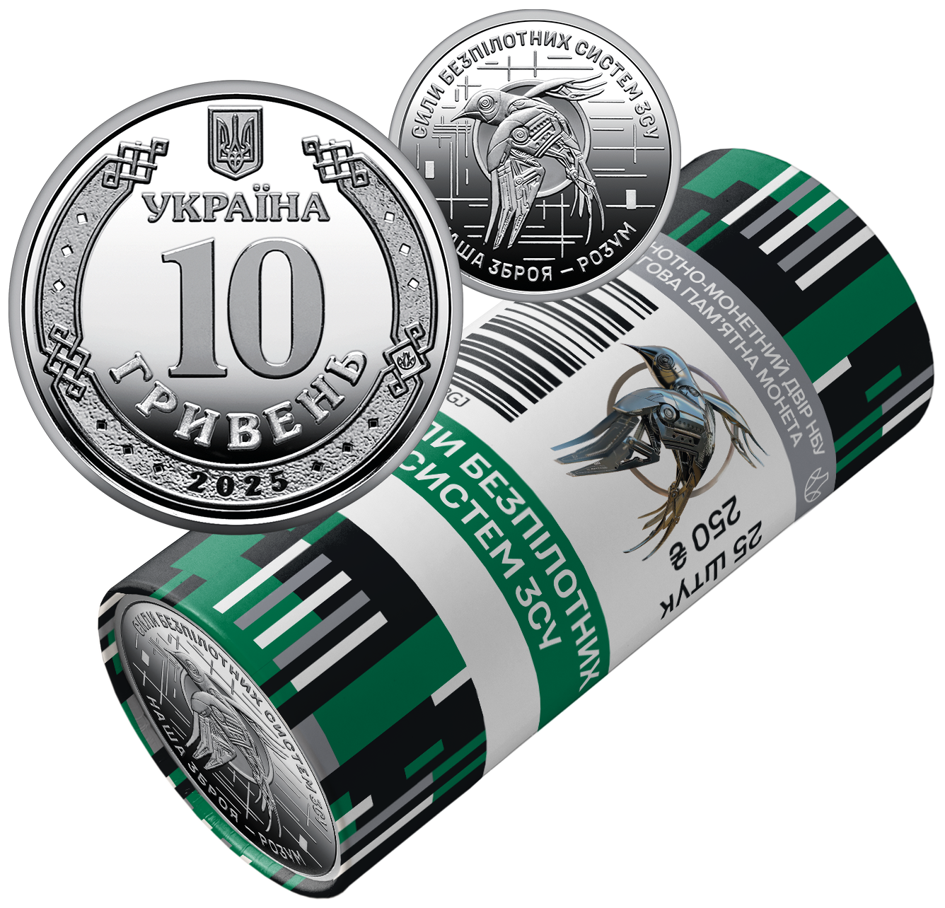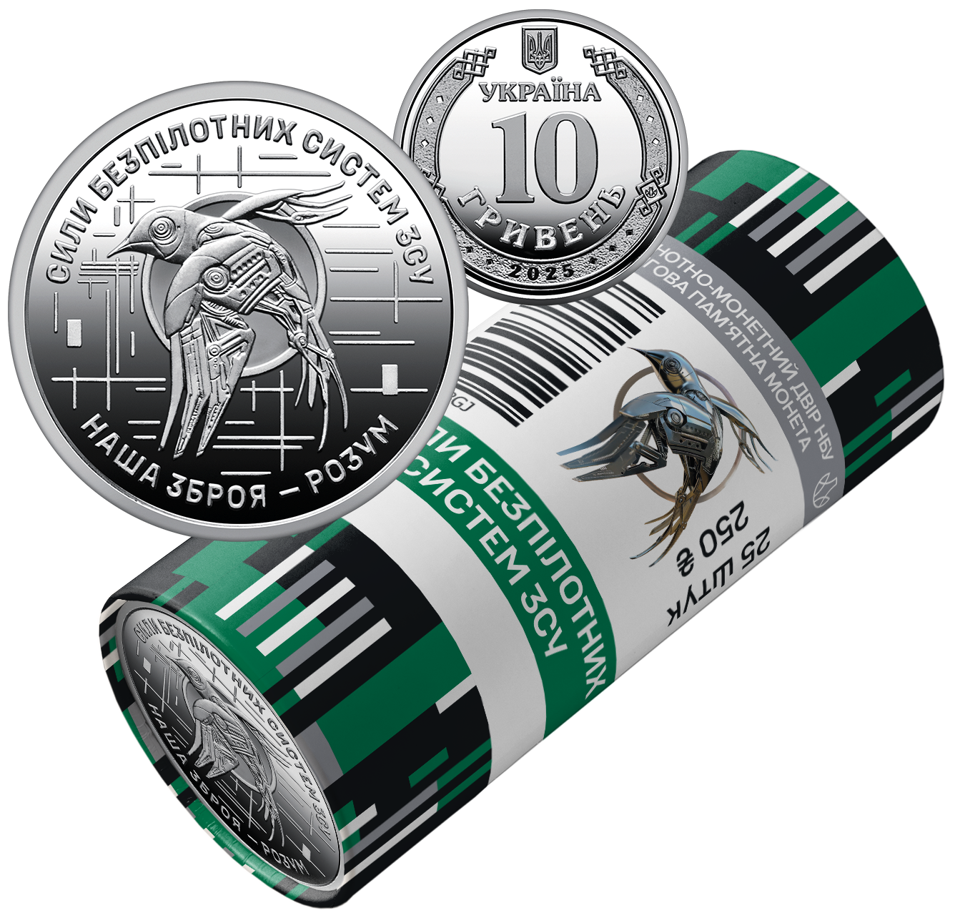 На сувенірному папері, у який запаковано кожний ролик, розміщено написи: БАНКНОТНО-МОНЕТНИЙ ДВІР НБУ, ОБІГОВА ПАМ’ЯТНА МОНЕТА, СИЛИ БЕЗПІЛОТНИХ СИСТЕМ ЗСУ, 25 ШТУК, номінал 250 та графічний знак гривні; логотип Банкнотно-монетного двору Національного банку України, зображення емблеми Сил безпілотних систем ЗСУ на тлі стилізованих повітряних потоків.