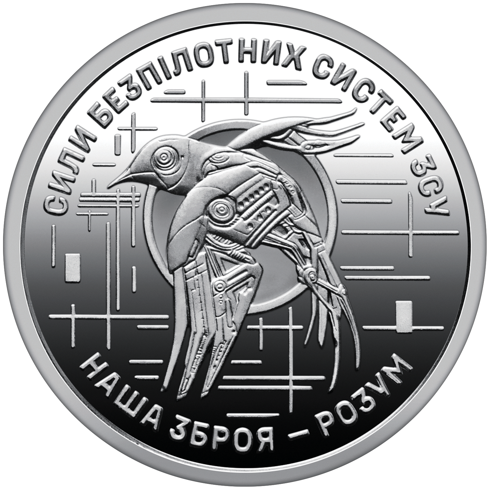 На реверсі монети по колу розміщено написи: СИЛИ БЕЗПІЛОТНИХ СИСТЕМ ЗСУ (угорі) та девіз формування НАША ЗБРОЯ – РОЗУМ (унизу). Головним елементом композиції є емблема Сил безпілотних систем ЗСУ – стилізована сталева ластівка, яка символізує технологічність, швидкість та адаптивність цього роду сил. Тло реверсу доповнене стилізованим зображенням повітряних потоків, що підкреслює динаміку, маневреність та малопомітність безпілотних систем.